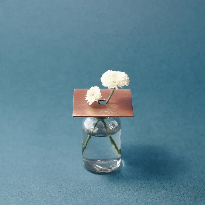 1. 空き瓶の使い道、あります なかなか捨てられずに取ってあった、可愛い空き瓶。いよいよあの子たちの出番です。 フラワースカーフの使い方は、空き瓶の上に載せるだけ。 新しい瓶が手に入るたび、新しい一輪挿しの完成です。 2. 花が傾いちゃう、そんな場面に 金属板が花を支える重しになります。 口の大きな瓶に一輪挿すとき、花が傾いてしまう…そんな場面にどうぞ。 瓶上部のネジ口を隠してくれるのも◎ 3. 手仕事の表情と経年変化 フラワースカーフは、板を丸く切り出す作業から表面の研磨まで、一枚ずつ手作業で製造しています。 機械で抜き出したのとは少し違う、柔らかい表情を目指しています。 また、フラワースカーフには変色防止加工を施していません。 そのため、時間が経つと黒っぽく変色したり、指紋跡や水跡が残ったりします。 これを重ねることで深い味わいが出てくるので、時間をかけてあなただけの1枚に育ててください。 育て直しをしたい場合は、乾いたナイロン不織布(台所用スポンジの硬い面など)で1、2分やさしく磨けば元のピカピカに。 4. サイズ 50mm角の金属板に直径7.5mmの孔が開いています。 おすすめは薬や栄養ドリンクなど、口の小さな瓶。 丸みのある空き瓶とシャープな四角で、どんなコーディネートが出来るか。 さあ、あなたの腕の見せ所です。 <商品内容> フラワースカーフ 四角 ×6点 1. フラワースカーフ
