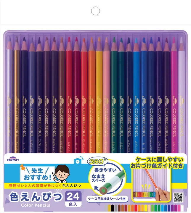 【整理整頓の習慣が身につく色鉛筆】 取り出した色鉛筆を元あったところに戻しやすい、お片付け色ガイドつきケースが付いたの色鉛筆24色セットです。 鉛筆には名前が書きやすい、ぐるっと360度なまえスペースが付いています。 ケースには名前シール付きで、紛失を防止します。 中身が見える透明ケースで色鉛筆の削り忘れを防止します。