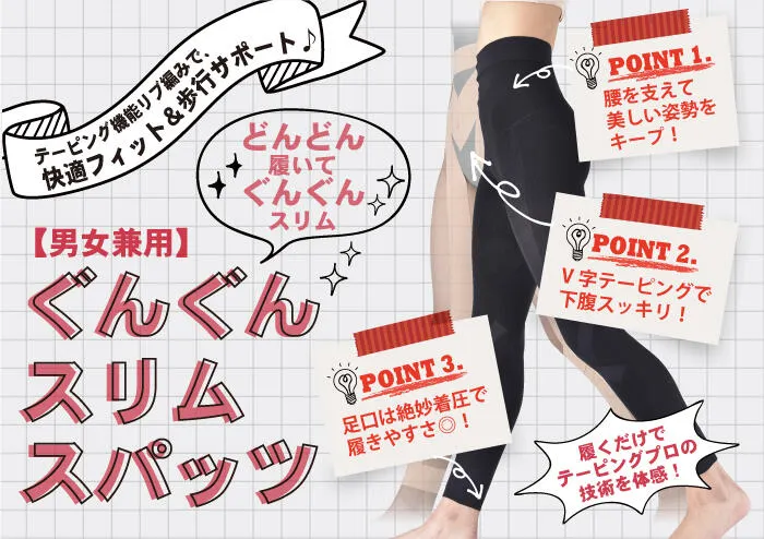 ■楽笑満足 ぐんぐんスリムスパッツ■ ・荷物の上げ下ろしによる腰・ひざ・脚の痛み ・長時間のデスクワークによる腰の痛み ・運動時の腰やひざの痛み ・家事を行う際の腰・ひざ・脚の痛み ・歩く際の腰やひざの痛み こんなお悩みをお持ちの方に、テーピングのプロが監修した 普段の生活が楽しくなるスパッツ ①締め付けすぎない履きやすい着圧設計 ②テーピング機能で下半身をしっかりサポート ③ウエストまで伸びたスパッツでお腹まわりをスッキリと ④シルクプロテイン加工により肌触りがよく常に快適な履き心地 ⑤安心の日本製 プロが考案したテーピング技術を施したスパッツ。 歩行・運動のブレの軽減をサポートしたり、快適なフィット感を提案する独自のスパッツです。 監修:齋藤 隆正 先生 国産のテーピングを日本で初めて上梓した企業にて販売促進、営業、製品開発を担当。 日本での普及に努め、当初よりインターハイ、国民体育大会などの会場で選手のけが予防のためテーピングサービスを行ってきた。 現在は生活の中でのテーピング方法として「生活テーピング」を提唱。 ☆シルクプロテイン 天然シルクから抽出された純度の高いシルクプロテインを生地コーティングさせることにより、シルクのもつ様々な特性を繊維に付与させました。 主成分であるシルクプロテインは、人の肌に近いアミノを大量に含んでおりますので、人の肌に優しく、 独特のサラリとしたボリューム感のある風合いと肌触りを演出してくれます。