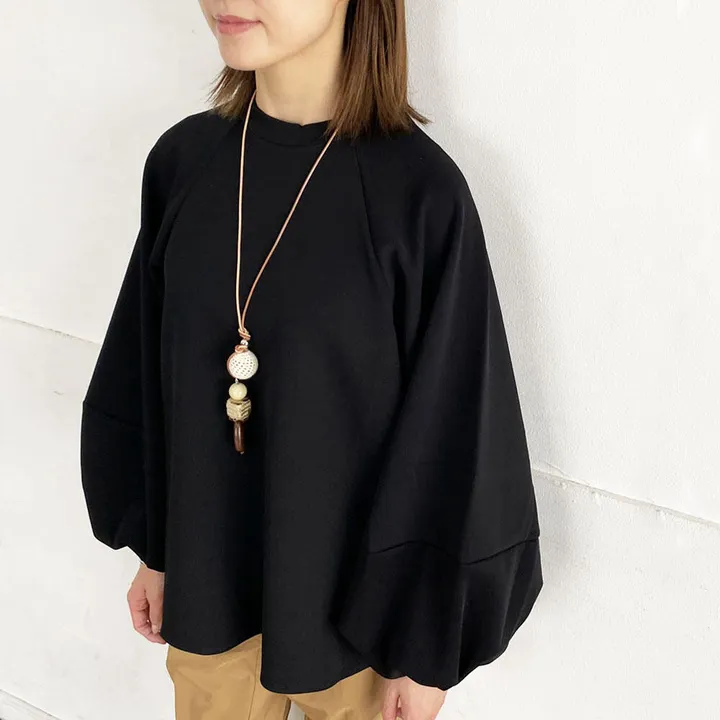 2重織ストレッチジャージ_ボリューム袖プルオーバー 立体感のあるカット?ブラウス ラグランで大きくボリュームのある袖口はゴムで バルーンのようなシルエットになっています。 少し厚手で伸縮性のあるきれい目の素材で 滑らかで肌触りのいいジャージ生地です。 しわになりにくい素材なので仕事着はもちろん 旅行などにもおススメです。 襟はほんのりとしたスタンド襟 ラグランスリーブなのでからのラインが綺麗です。 切替をいれたたっぷりとしたボリューム袖に 袖口にゴムをあしらっています。 ベア鹿の子2重織ストレッチジャージ ポリエステル96%ポリウレタン4% 発色性のよい高収縮ポリエステルを使用した2重織ストレッチジャージ 優れたストレッチ性と反発感のある風合いが特徴です。 はりがあり、ふくらみのある素材感で 表地は鹿の子でシャープな印象 裏地は肌触りは柔らかくさらっとしています しなやかな生地でしわになりにくく着心地抜群です。 made in japan 【日本製】2重織ストレッチジャージ_テイパードパンツ【セットアップ対応】 https://goooods.com/products/de5c174e-ae95-4946-8e8e-6a7a21d94ab3/ee5c61b6-a713-401c-a59a-a044774e5e53