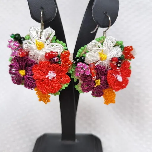 サイズ:約φ4~5cm フック部分含む最長約5.5cm 色鮮やかなお花のモチーフに様々なビーズなどをちりばめたピアス 耳元で華やかでキュートにお顔周りを彩ります。 トルコの伝統手芸 oya 起源は不明らしいのですが、大昔は 魚を捕る網がすでにその技法だったといわれています。 イスラムの女性たちは髪を隠すためにスカーフを覆います。 はるか昔に使われていたその技法が、イスラムの文化圏でスカーフの縁どりに 装飾されおしゃれを楽しむようになったようです。 オヤはトルコ語で縁飾りを意味します。 技法や手法によって呼び名が変わるそうです。 針を使う技法、かぎ針を使う技法 または、ビーズや石などを編みこんでいる手法など。
