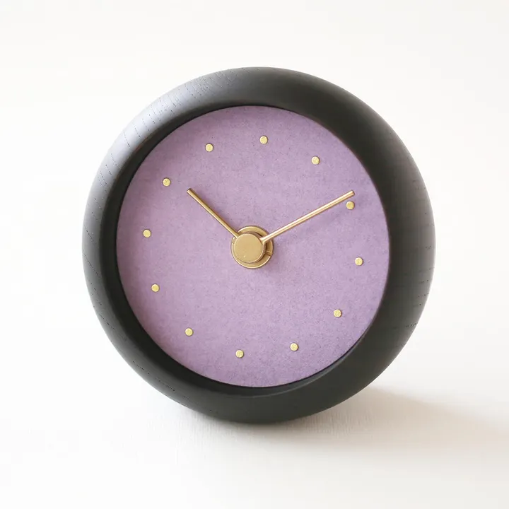 文字盤にスギライト(杉石)を砕いた粉末(岩絵具)を塗りました。スギライトは1943年に日本で初めて発見された鉱物で、日本の岩石学の基礎を築いた学者「杉健一」の名前をとって命名され、日本人名が付いた唯一の宝石です。普通の絵具では出せない透明感のあるやさしい色彩とザラザラした岩絵具特有の質感をお楽しみ下さい。 本体は、漆器の産地として400年以上の歴史を持つ石川県加賀山中の「ろくろ引き」という、回転する木に鉋(カンナ)を当てて形作る方法で製作しました。 素材はケヤキで、木目が美しく、なめらかでしっとりとした質感です。 文字盤は、下地に金沢市二俣町で和紙作りをされている、石川まゆみさんに漉いていただいた和紙を使用し、 その上に天然石を砕いて作られる「岩絵具」を幾重にも塗り重ねています。インデックスは金沢の金箔です。 ■木の部分の色は、プレーン・ブラウン・ブラックの三色をご用意しております。 ■裏面カバーにオリジナルの刻印を入れることができます。(有料 +880円税込) ■受注生産のため、基本的にご注文いただいてから約2週間のお時間をいただきます。ご了承ください。 【時計部分の仕様】 ・日本製・1年保証・本体のサイズ:直径10cm厚さ5.4cm・使用電池:単3形乾電池 【付属品】 ・単3乾電池1個・取扱説明書1部・牛革製裏面カバー