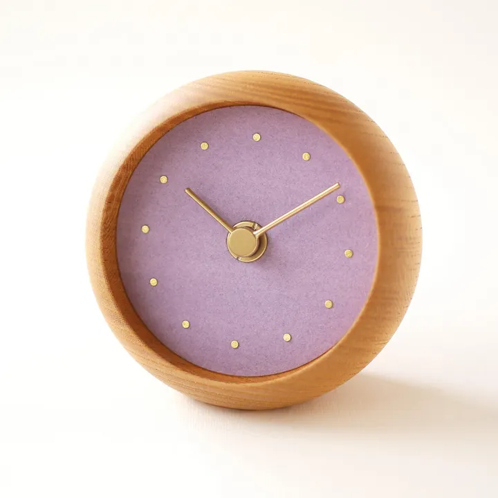 文字盤にスギライト(杉石)を砕いた粉末(岩絵具)を塗りました。スギライトは1943年に日本で初めて発見された鉱物で、日本の岩石学の基礎を築いた学者「杉健一」の名前をとって命名され、日本人名が付いた唯一の宝石です。普通の絵具では出せない透明感のあるやさしい色彩とザラザラした岩絵具特有の質感をお楽しみ下さい。 本体は、漆器の産地として400年以上の歴史を持つ石川県加賀山中の「ろくろ引き」という、回転する木に鉋(カンナ)を当てて形作る方法で製作しました。 素材はケヤキで、木目が美しく、なめらかでしっとりとした質感です。 文字盤は、下地に金沢市二俣町で和紙作りをされている、石川まゆみさんに漉いていただいた和紙を使用し、 その上に天然石を砕いて作られる「岩絵具」を幾重にも塗り重ねています。インデックスは金沢の金箔です。 ■木の部分の色は、プレーン・ブラウン・ブラックの三色をご用意しております。 ■裏面カバーにオリジナルの刻印を入れることができます。(有料 +880円税込) ■受注生産のため、基本的にご注文いただいてから約2週間のお時間をいただきます。ご了承ください。 【時計部分の仕様】 ・日本製・1年保証・本体のサイズ:直径10cm厚さ5.4cm・使用電池:単3形乾電池 【付属品】 ・単3乾電池1個・取扱説明書1部・牛革製裏面カバー