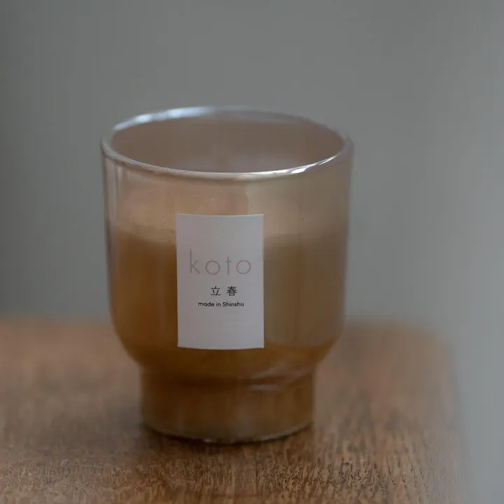 kotoの自社アトリエで作る四季巡る二十四節気のキャンドルは、厳選した原材料を配合し、ブレンドや調合、箱詰めまで一点一点職人の手によって心を込めてしつらえています。 大豆とアブラヤシの天然ワックスを独自にブレンドし、香りの拡散と持続、燃焼効率に優れたハンドメイドキャンドルをお届けします。 一年の始まりは立春から――古くよりそう語られてきました。 まだ冬の冷たさを残しながらも、空気はやわらぎ、春の兆しがそっと顔をのぞかせる頃。白梅がほころび、ウグイスが軽やかに歌いはじめると、自然が目覚める音が胸の奥に響いてきます。春の足音は、希望を伴って静かに訪れるのです。 「立春の香り」は、その季節の移ろいを映した、果実の甘やかさと安らぎをあわせ持つフレグランス。灯した瞬間から、心に春のひかりを呼び込みます。 まずトップノートでは、シトラスの爽やかさが空気を切り拓き、そこにブラックチェリーの甘酸っぱさが重なります。最初の一息で感じるのは、みずみずしくはじける果実の明るさです。 続くミドルノートには、熟れたプラムが濃厚に香り、香り全体の核となる豊かな甘みを描き出します。それはまるで春の庭に漂う花と果実の深い息吹のよう。 そして時間とともに訪れるベースノートでは、アンバー、シュガー、バニラがとろけるように広がり、ムスクとフリージアがやわらかな土の気配を添えます。香りは落ち着きと甘やかさを兼ね備え、余韻となって長く寄り添ってくれるのです。 さらに、シダー、ベルガモット、クラリセージの天然精油が奥行きを加え、透明感と自然の力強さを秘めた香りへと昇華させています。トップには小さな鈴のようなピンクの花を咲かせるヒースをあしらい、目にも春の芽吹きを感じられる仕立てにしました。春のやわらかな息吹が空間を満たし、心に希望の芽が静かに育ってゆきます。 二十四節気の移ろいに寄り添うように、kotoのキャンドルはすべて厳選された原材料を用い、自社工場で一点一点、手作業で仕立てています。ワックスの配合や芯の細部に至るまで丁寧にこだわり、美しく灯りと香りを楽しんでいただけるよう心を込めています。朝の始まりから夜のひとときまで、季節の気配を感じる香りが日常に溶け込み、暮らしのリズムにそっと寄り添ってくれます。 また、キャンドルを包むグラスは、使い終えた後に湯煎して洗うことで、繰り返しお使いいただけます。kotoがご用意する別売りのティーライトキャンドルを中に入れて灯せば、二十四節気の香りをより気軽に楽しみ続けていただけます。香りと灯火を長く愛でながら、持続可能なかたちで季節の移ろいを感じていただけるように、私たちはものづくりに心を尽くしています。 【使用上の注意】 灯している時はキャンドルのそばから離れないようにしてください。一度に2時間以上の燃焼はおやめください。長時間燃焼すると、グラスが大変暑くなり破損する恐れがあります。芯が長くなったり曲がったりすると火が大きくなったり、黒い煙が出やすくなります。灯す前に芯を7mm程度にカットし、整えてください。お子様やペットの届くところでの燃焼はおやめください。サイズ選択数量 カートに追加する