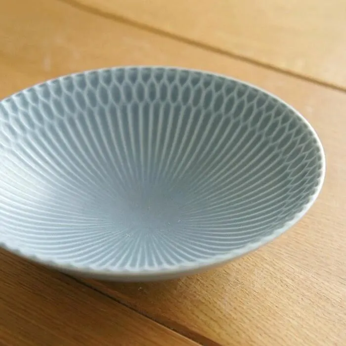 水面に広がる小波のような美しい凸凹が目を惹く器。 青みがかった神秘的な艶あり白と、落ち着いた上品なマットなブルーグレー。 和テイストな料理にぴったりの器です。 種類は取り鉢(13cm)、21cm深皿、小皿(9cm)、猪口、どんぶりがあります。