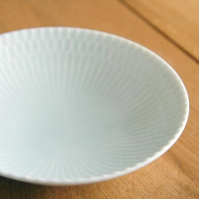 水面に広がる小波のような美しい凸凹が目を惹く器。 青みがかった神秘的な艶あり白と、落ち着いた上品なマットなブルーグレー。 和テイストな料理にぴったりの器です。 種類は取り鉢(13cm)、21cm深皿、小皿(9cm)、猪口、どんぶりがあります。