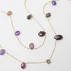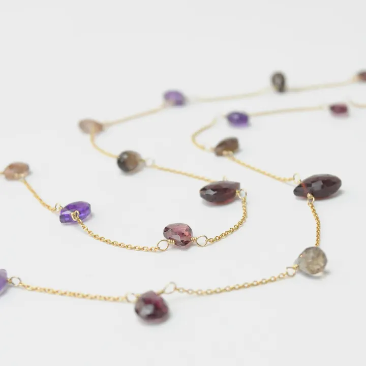 ワインレッドのような深い赤と女性的なパープルの色合いが特徴的な大人色のロングネックレス。 スモーキークォーツ、アンダリューサイトのブラウンカラーが柔らかなニュアンスをプラス。 マーキースシェイプ、ペアシェイプ、ドロップなど形、サイズが組み合わせられたひらひらと軽やなネックレスです。 84〜89cmの長さに調節可能 <K14ゴールドフィルド> 真鍮の芯にK14を熱で圧着させた素材。 メッキとは違い、変色やアレルギーの心配がほとんどなく、長くご愛用いただけます。 ※天然石を使用しているため、自然のクラックやインクルージョンが見られる場合があります。 ※モニターの明るさなどによって実際の色と差が出る事があります。 日本発のブランド — anq. / アンク — 様々な分野を学んできたクリエイターたちで構成されたデザインチーム。 「可能性を秘めたもの」をコンセプトに女性の好奇心、探求心、遊び心をくすぐるようなジュエリーを提案しています。 メイドインジャパンにこだわったジュエリーを、銀座のアトリエで一つ一つ制作しています。