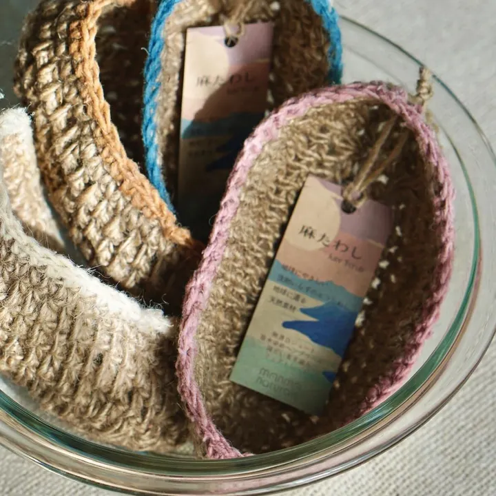 【100%天然素材】【国内フェアトレード】 【リニューアル】 さらに使いやすくするため、ジュートの編み糸の太さと編み方を工夫し、大きさと形はそのままで、新しく生まれ変わりました! 丈夫さは保ちながらもより柔軟になったので、グラスやカトラリーなどの繊細なものも洗いやすくなりました。 ぜひお試しくださいね。 〖地球をきれいに!プロジェクト推進商品〗 世界中の人が使う洗剤やシャンプーなどに含まれる合成界面活性剤が海や川を汚しています。 地球の60%、人体の70%が水です。水が汚れたら私たちも汚れます。 manma naturalsは地球に還らない化学成分の使用をやめることが重要と考え、地球を汚さない製品を厳選し提供します。 ◆洗剤いらずで、環境に優しく◆ ジュートでできた、洗剤いらずのエコたわしです。 程よい硬さで、汚れをしっかり落としてくれます。油汚れも洗剤なしで落ちるので環境に優しく、さらに経済的。 食器だけでなくお風呂洗いなどいろんな用途でお使いいただけます。 〖洗剤がなくてもピカピカに〗 油がついた食器でも、お湯と麻たわしで洗うと、洗剤を使わなくてもすっきりピカピカに。洗剤で溶かして流すのではなく、麻たわしでこすり落とす方法ですので、少量の水やお湯で流しながら洗うのがポイントです。 ✧洗い方✧ ・流水で軽くこすり洗い。 ・キレイなものから油っぽいものへ順に。 ・麻たわしが油っぽくなったら、流水でゴシゴシもみ洗い。 ・使い終わったら必ずフックにかけて水切りしてください。 〖土に還る素材を使用〗 麻(ジュート)は成長が早く、農薬もいらない優れた植物です。最後は土に還るので、環境に優しい点も魅力。使うほど柔らかく手になじみ、優しい味わいになります。 〖人にも地球にも嬉しい草木染〗 製品のふちを彩る色糸は、草木染で色を付けています。合成染料のように水を汚さないので環境にも製造者にも優しく安全です。カラーは、ピンク、ブルー、オレンジ、ホワイトの全4色。自然な優しい色合いで、使うほどに味わいが増していきます。 ◆国内フェアトレードで、障害者さんの自立を応援◆ 障害者の方々のお仕事は、信じられないほど低賃金です。例えばお菓子の袋詰の仕事なら、健常者の場合20円程度が支払われているにもかかわらず、障害者の方々の場合は1袋2.5円。そこから障害者さんに手渡されるのはたった1円といったケースも多いのです。ですがその仕上がりは、健常者のクオリティと同じです。 マンマナチュラルズはこのような通例を変えていけたらと、麻たわしの制作を健常者と同賃金で依頼。編み子さんも施設の方々もやる気と誇りを持って作業しています。 ◆買い物は投票だ!◆ マンマナチュラルズでは、私たちが何を選び、何にお金を払うかで、この社会が作られていくと考えています。国内のフェアトレードが増えて、障害者さんたちが誇りを持って自立できる社会になれば素敵です。そしてそれは私たちの「買い物は投票だ!」の力で実現できると信じています。 ◆エコパッケージ◆ 環境や限りある資源のことを考えて、ビニール袋などには入れずにお届けしています。