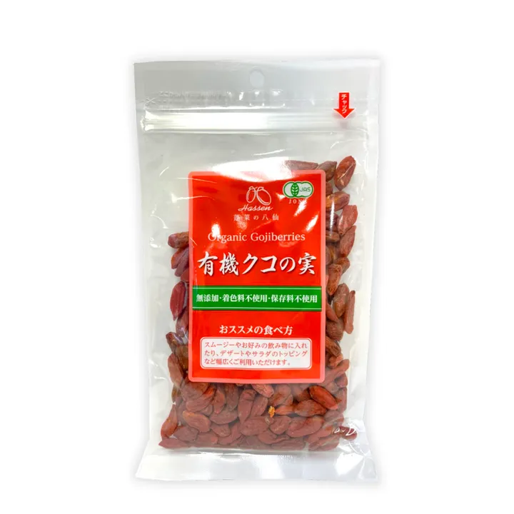 ■【オーガニッククコの実】 発売から約20年、超ロングセラーの大人気! オーガニッククコの実のパイオニアがお届けする規格上最大の粒の大きさを誇っています。 オーガニッククコの実の開発から携わり、今オーガニッククコの実は世界の オーガニックゴジベリーへと成長しました。 生薬の素材として、古から人々の健康に寄与してきたクコの実は、まさに八仙が目指す 「食養生」では欠かせない素材の一つです。 ■【目の成分・ルテイン・ゼアキサンチンがすごい!】 ゼアキサンチン含有量は <ブルーベリーの約1000倍> 近年、目のトラブルに注目されている成分で、サプリメントにも多く配合されています。 特に目の黄斑部はこの2成分で出来ているといわれており、体内では作られないため 食べ物から摂るしかありません。 アイケアに注目のゼアキサンチン分を食品中最も多く含むと言われているのが、 クコの実ですが、中でもオーガニッククコの実は実際の成分検査をして、含有量の 多さを証明しております。 ■自然由来の栄養成分 ・アミノ酸19種(必須アミノ酸9種含む)・ビタミン・ミネラル・ポリフェノール・葉酸 ・ナイアシン・パントテン酸・食物繊維・オレイン酸・リノール酸・オレイン酸・パルチミン酸 ・クコ多糖類(LBP)など ■【クコの実はアミノ酸の含有量が多い!】 ・プルーンの4,2倍! ・ブルーベリーの4,2倍! ・ココナッツウォーターの35倍! 必須アミノ酸9種を含む、18種類のアミノ酸が自然由来で入っています。 豊かな良質のたんぱく質を植物から摂っていただけますので、スポーツやフィットネスなどのシーンの他、日々の栄養補給にもオススメです! ■【原料認定取得各種】 有機JAS・アメリカUSDA・EU BCS・ハラール・コーシャ・FDA 【ドライクコの実はこんな方におススメ】 ●目がしょぼしょぼ気になる方 ●PC、タブレット、スマホで目疲れが気になる方 ●ヨガや体を動かすアスリートの方 ●疲れが取れないと感じる方 ●お肌が気になる方 ●インナーケアから始めたい方に ●日々の健康を意識している方 などなど ●HASSENの有機クコの実は安心・安全品質のJAS認定の中でも特にグレードが高くクオリティの高さが評判の大粒肉厚クコの実です。 自然由来の豊潤で豊かな風味を味わってください。クコの実は日本スーパーフード協会が推奨するスーパーフードのプライマリーTOP10に入っています。 ■有機JAS認定■USDA・EUオーガニック認定 【ちょっと特別なクコの実】ここがすごい!! ①<幸福の宝石>超特大粒を厳選!年間生産量の中でも摂れるか摂れないかの希少粒を数量限定でお届け! ②男性も必見!自然由来の<アルギニン>を含むアミノ酸がギッシリ!体は食べたものでできている! ③自分を大切にできるのは自分だけ。大切な自分へプレミアムなご褒美を! 昨今の急激な生活の変化で多くの方が体を大切にすることを改めて見直ししたことと思います。 この期間を通して、私たちが気づいたのが<事前に防ぐ>ことが最も重要なことの一つだったのではないでしょうか。 自分で自分を守らなければ、大切な人をも守れなくなってしまうという危機を実感しました。 今、私たちは心と体、両方の<養生>に目覚め、改めて本当に良いものを知り、未来に向けて体を日々 大切にしていく重要性に気づくことができました。 5年後、10年後の自分と大切な未来の笑顔のために 始める養生という考え。日々の積み重ねが自分を守るカギとなるのではないでしょうか。 あなたの体を守れるのはあなただけなのです。 環境の変化に頑張った自分へのご褒美と未来へつなげる一歩としてお届けしたい特別なオーガニッククコの実です。 オーガニッククコの実のパイオニアが届けるオーガニッククコの実史上、類稀な<幸福の宝石>登場!! 本物のオーガニッククコの実は進化しています。現状に満足せず、常に研究と挑戦を繰り替えし、より良い身体環境をサポートし、 地球環境に配慮するため進化しています。今日紹介するのは、その進化の賜物であり、多くの方の想いが詰まった <幸福の宝石>プレミアムと呼ぶにふさわしい『奇跡のオーガニッククコの実』です。 1:アミノ酸(必須アミノ酸を含む)18種!! 人間の体に欠かせないアミノ酸。オーガニッククコの実には体内では生成されない<必須アミノ酸9種>を含む18種のアミノ酸が自然由来で入っています。 2:ゼアキサンチン 目の中心である黄斑部や肌、脳、乳房などに含まれるルテイン+ゼアキサンチンは、体内で作り出せない成分のため、食べて補うしかありません。 サプリメントも多数ありますが、自然の食事の中で補いたいのが本望。クコの実はその紅色を作り出しているのがゼアキサンチンであり、 食品中でも極めて高い含有量を誇ります。これからの季節、強い日差しの多い日にもおすすめです。 3:ビタミン類など自然由来の栄養 オーガニッククコの実は、自然由来で多用の栄養を含んでいます。古来より重宝され、長い歴史の中で証明されてきた<男性のガソリン・女性のエ
