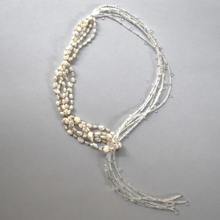 【一合】 昔から日本では 何かあるたびに米や塩を 食べる目的以外のことにも使用してきました 米は五穀の一とされ コムギとともに世界で最も重要な食糧穀物です 一合とは尺貫法における面積・容積の単位で 一升の十分の一を指します 一合のお米があれば 土地神様へのご挨拶もできますし 一日の食事を賄うことも可能です --- ネックレスはコーディネートに合わせて自在に変化します 前に垂らしても 後ろに垂らしてチョーカーとしても 敢えて選んだ不揃いな淡水真珠が顔まわりを穏やかに彩ってくれます material 淡水真珠、ガラスビーズ、真鍮、テグス *ゴールドビーズは本金メッキ加工を施したものを使用しております *淡水真珠は養殖された淡水貝から取れる無核真珠です。天然素材のため、色・形大きさにばらつきがあり、表面にシワや若干の傷があるものが含まれます。着色はしておらず、素材そのものの天然色です。 size 約650㎜ weight 約46.0g *CACICOの商品は全て1点1点制作しているため、個体差があり、商品写真と差がある場合がございます。ご了承の上、ご購入ください。 *金属アレルギーの方はご使用をお控えください