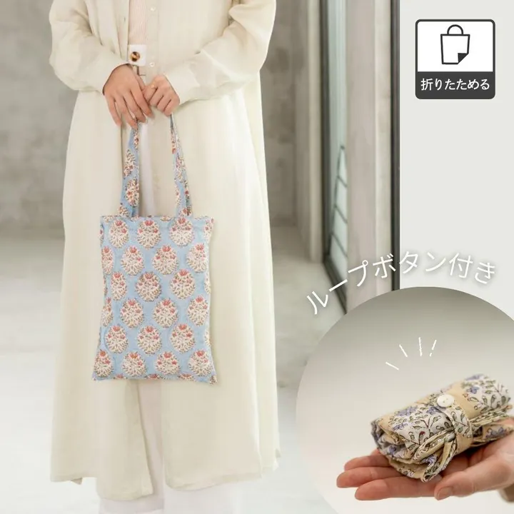 優しい色合いと素朴な小花柄がインドらしいブロックプリントのバッグは、シンプルな装いのアクセントに。 サブバッグとして使っても、プレゼントやお土産を入れてもちょうど良いサイズ感! ギフトバッグにもおすすめです。 【ブロックプリントについて】 ブロックプリントとは、木彫り版でハンコを押すように1柄ずつ1色ずつプリントされたものです。 まず、アウトラインとなる柄のスタンプを押していき、そのあと色をのせていくため、使われている色の数だけ作業は複雑になっていきます。 染ムラやスタンプの境目が少しゆらいでいる場合もありますが、それも手作業ならではの良さであり、風合いとなっています。 *ブロックプリント *内ポケット×1 【ファッション雑貨】【鞄/カバン】【エコバッグ】
