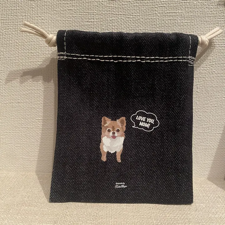 【Mサイズ 巾着 / 厚手生地】 オリジナルイラスト わんこ巾着 小さい巾着 プレゼントに◎ チワワ (約110mm × 90mm)