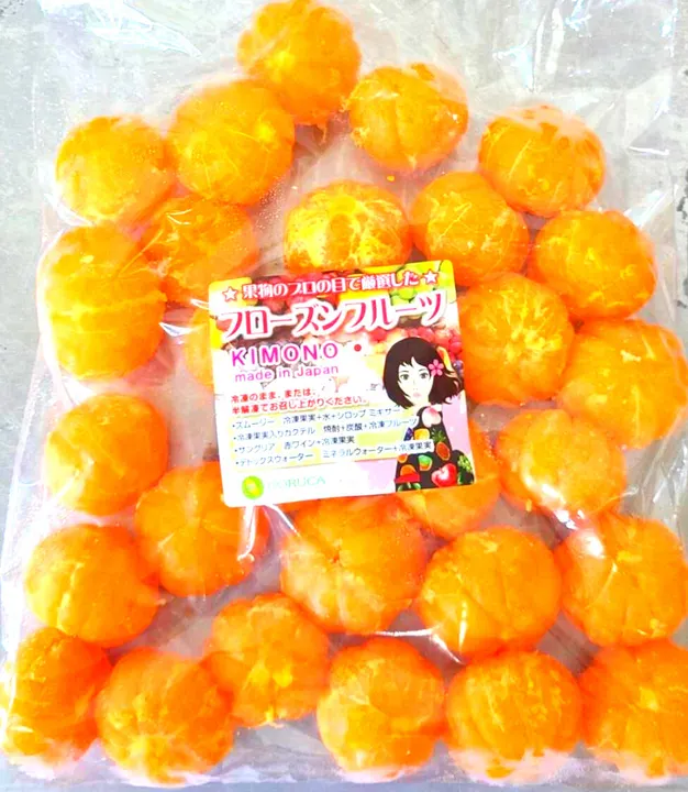 果物のプロの目で厳選した冷凍フルーツ 有田みかん、または和歌山みかんの短い旬の美味を凍らせました。畑で、もぎ取り後ノーワックスの和歌山有田産の新鮮なみかんをひとつづつ外皮のみ手剥きしました。ジュースやマーマレード製造にお使い下さい フルーツの皮を剥き、使いやすいサイズに素早くカット、真空パック加工後、急速冷凍していますので、果実本来の風味と味覚が楽しめます。 スムージー、フルーツウォーターの材料 として、フルーツカクテル用のフルーツとして、冷凍フルーツは、注目を浴びています。 スムージー作りの 原料として、 みかん 100g、 お水または、牛乳 100g、 シロップ 15g ミキサーすれば、みかんスムージーが出来上がります。