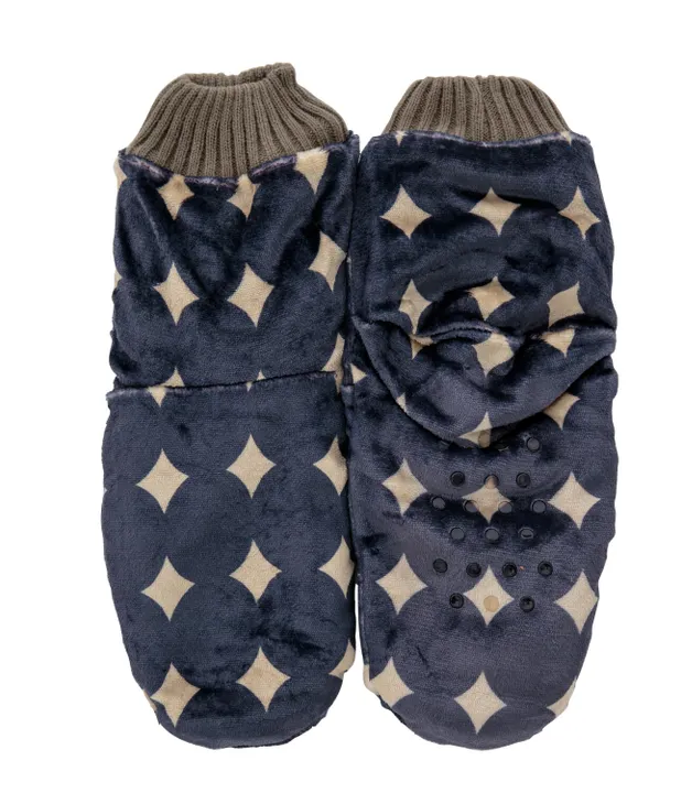 靴下とスリッパの間のように使っていただくことをイメージしたカバーソックス。 プレゼントにちょうどよく、毎年人気です。 フリース生地にカラフルなテキスタイル柄をプリントしました。 靴下の上から重ね履きできるゆとり感があり、スリッパに比べて保温性が高いのですが、スリッパのボリューム感はないので、履いたままソファでゴロゴロなども可能です。 履き口のリブニットが伸縮するので着脱しやすく、幅広い年齢層の方へのプレゼントとして大変喜ばれます。 内側はボア生地、足裏は滑り止め付きで安心です。 ショート丈は足首までしっかり温められるのでルームブーツ感覚でご使用いただけます。 短めのアンクル丈もございます。