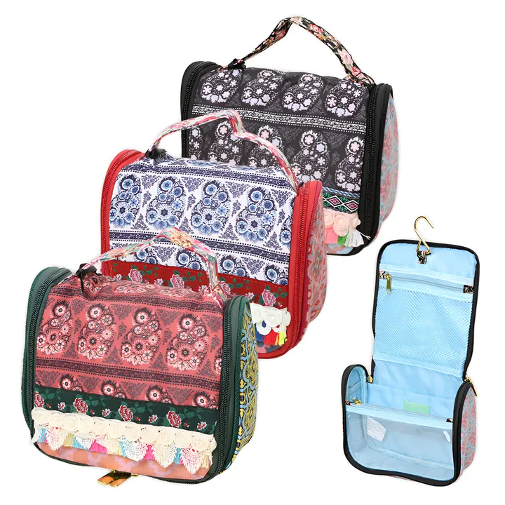 モロッカン柄のプリント生地をベースに、複数の柄生地とフリンジやレースをあしらった民族調で鮮やかなシリーズ。 もちろん旅行グッズとしての機能性も兼ね備えております。 マチのあるタイプの吊りポケットは旅を快適にするスグレモノ! ボトルやブラシなど厚みのあるものがスッキリ収まって、旅先ではそのままフックで掛けて使えます。 ハンドル付きで持ち運びも楽々♪