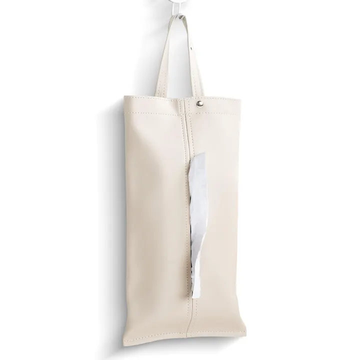 置き場所に困るティッシュも、これでスッキリ♪ おしゃれな吊り下げティッシュケースなら、 フックやドアノブに掛けるだけで生活感を隠せます。 高品質な合皮素材で水も弾くので、 洗面所やキッチン、車の中でも安心して使えます。 段階調節の取っ手付きで、 ベビーカーや玄関ドアにも吊り下げ可能。 キッチンペーパーやマスクなど、自由に収納♪