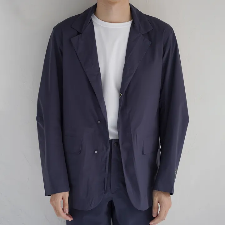 都市の暮らしにマッチする、2WAYジャケット。 別売りのTSUZUMI PT (FA007) とセットアップ可能。 本格アウトドア用に匹敵する耐水圧と透湿性を兼ね備えた「BARRIER EFFECT.」によって水分含浸を防ぎつつ、衣服内の蒸れを素早く解消してくれる。軽量でしなやか、かつストレッチ性を備えた生地はストレスフリーの自然な着心地を実現。 衿を倒せばテーラードジャケット、マグネットボタンで衿を立てれば防水ジャケットに早変わり。 ポケットが左右2つと内側に4つの計6か所あり収納力も抜群で、左下内ポケットをひっくり返し本体を入れパッカブルにする事ができ携帯に便利です。 ボタンで脱着可能なフードも付いていますので急な雨やフード付きジャケットとしても楽しむことが可能。