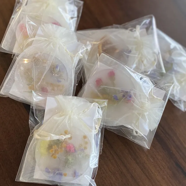 ドライフラワーと香り付きのワックスを上品なオーガンジー袋に詰め込みました。 1袋の中にサンキューカードを1つずつ入れているためイベントなどのノベルティに最適です。 ※こちらはサンプルのお届けになります ▼お届け内容 ・サシェ×1個 ・香りのムエット×3種類 ◼︎香りについて フレグランスオイルと天然のアロマオイルを調合したオリジナルの香りをご用意。 ▼香り ①ローズペタル 華やかなローズの香り。植物の香りの奥に深みのある上品な香りが広がり玄関などにぴったりな香りです。 ②フルーティ オレンジと近い甘い香り。柑橘系をベースに甘い香りがふんわりと広がります。少女のような元気で優しい印象の香りです。 ③リネン せっけんのような清潔感のある香り。柔軟剤のような清潔感のある香りが広がります。香水のような強い香りが苦手な方にはオススメです。