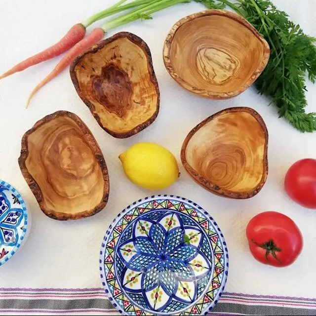 サイズ:約φ11~15×高さ2~5cm 自然の姿をそのまま生かしたものですので個体差がかなりあります。 *オリーブの木をくり抜いた表皮付きのボウル。個性的なカタチが存在感あり。 *木目の表情は大自然の恵みの力をそのまま残した生命力溢れる絶品です *天然木材の持つ風合いと手触り、一つとして同じ木目や色が存在しない、世界で唯一無二な存在感を満喫して頂けます。 *食卓以外でもアクセサリーや陶器などディスプレイにも素材力を発揮し、お料理だけでなくさまざまな小物のステージを演出してくれるでしょう。 *オリーブの木はとても硬く傷つきにくい特徴があります。 木目も一つとして同じものはないので、それぞれに個性があります。 ※ 全て手作りの為、大きさ、厚み、色、形の誤差はあります。過度の乾燥はひび割れの原因になります。長時間お湯、水にさらさないで下さい。食器乾燥機、洗浄機、表面の硬いスポンジやたわしで強くこすることは避けることをオススメします。以上のことご注意いただけるとオリーブの風合いを長期に渡ってお楽しみいただけますのでご了承下さいませ。
