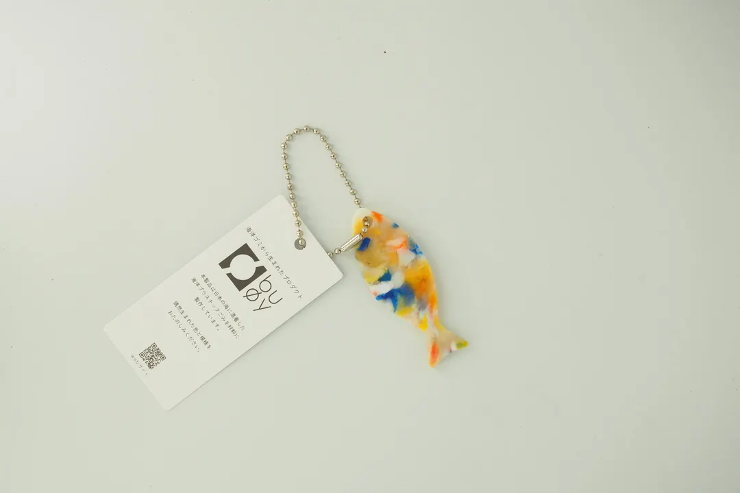 お魚型のシンプルなキーホルダー。 buoyの製品は全て日本各地で回収された海洋プラスチックごみを材料に作っています。着色などの加工を加えず、偶然海岸に漂着した色味でできています。 明るい発色が特徴のプラスチックですが、複数の色が交じり合うことでちょっと有機的なモザイク模様が特徴です。 製品にはひとつひとつゴミの漂着地域が明記されています。日本で起きている海洋ごみの問題をリアルに感じることができます。 また、商品に添付されているQRコードを読み込むとそれぞれの回収を行ったビーチクリーン団体さんの情報を見ることができます。 ------------------------------------------------------------------- 海洋プラスチックごみを材料に変える独自技術buoyの特徴 (buoyは海洋プラスチックごみ素材使用を前提にした株式会社テクノラボの独自技術により成形しています。株式会社テクノラボは本技術において特許取得済み) ◆材料を分けないで成形するため生まれる独自の模様 材料はすべて着色せず海洋ごみの色を活かして成形しています。偶然生まれる色と模様は回収された漂着ごみによって決まります。 ◆製品の重さが海洋ごみの重さ 製品をコーティングしているフィルム以外、混ぜ物などせず海洋ごみでできているので製品の重みから海洋ごみ問題を感じられます。 ◆製品にすべて材料の漂着地を明記 buoyは日本各地のビーチクリーンボランティアや企業の方から材料を提供していただいています。これらの材料は時期と地域を分けて管理され、製品にはすべて材料産地のシールを貼り販売しています。 buoyの材料産地をきっかけに回収された地域のことを知ってほしいとの思いからbuoyでは団体様の紹介ページを作成しています。 http://www.techno-labo.com/rebirth/partner/ -------------------------------------------------------------------