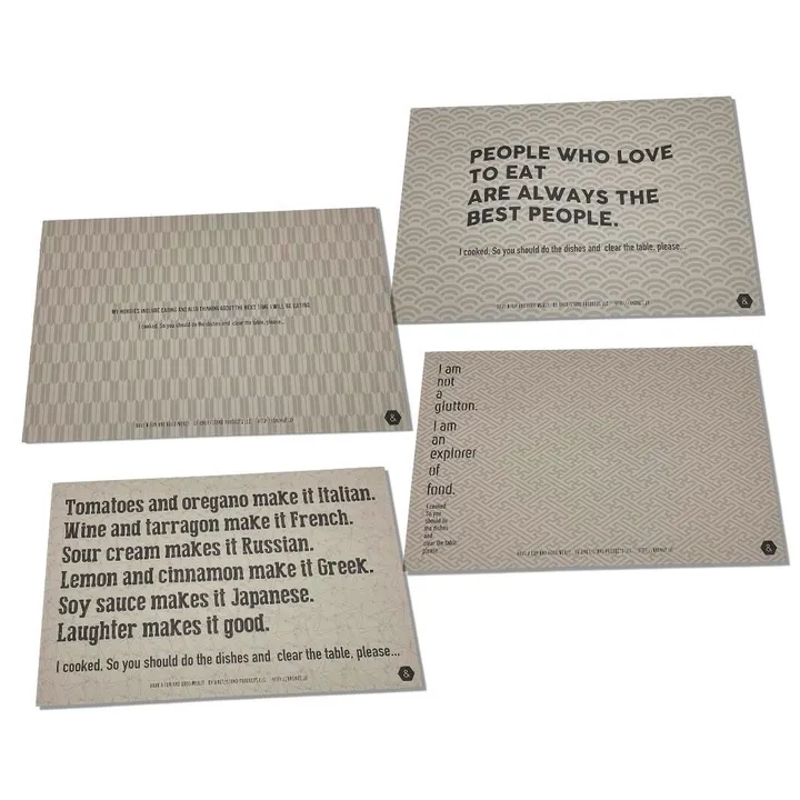 日本の古典柄を背景にあしらったペーパーのランチマットです。 布や塩ビ・レザーなど、いろいろなランチマットもありますが、結局お手入れが面倒臭くて使わなくなったり…。 その点、紙のランチマットであれば、食事のあとはクシャッと丸めてポイッとゴミ箱へ。お片付けもチョー簡単です! サイズも450x300と、一般的なランチマットよりも少し横長になっています。 4つのデザインが交互に30枚ずつ綴られているので食卓にすこし変化をつけることもできます。 1枚当たり約15円とリーズナブルなので、使い捨ててもそんなにココロは痛みません。 Product Description Paper lunch mats featuring backgrounds inspired by traditional Japanese patterns. Fabric, PVC, or leather mats can be nice, but they often go unused because cleaning is a hassle. With paper mats, cleanup is easy—just crumple and toss after the meal. Sized at 450 × 300 mm, they’re slightly wider than standard lunch mats. The set includes four alternating designs, 30 sheets each (120 sheets total), adding subtle variety to your table. At about ¥15 per sheet, they’re affordable and easy to use without guilt—even as disposables.