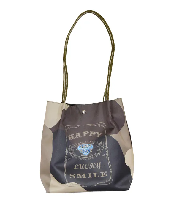 ティピィカレン スクエアタック付けダブルハンドルショルダーバッグ。 光沢感あり、発色がよく、高級感のある素材感が魅力です。 タペストリーやカーテンなどのインテリアファブリックで、生地の厚みや硬さ、強度などが高くバッグとして扱いに適している素材です。撥水ではありませんが水にも強いです。 片面は大きめのカモフラージュに青い宝石にバーボンロゴ、もう片面はピンク宝石にハリウッドロゴ、ヴィンテージ感のあるアメリカンスタイルを意識してデザインしました。 15mmのラインテープも厚みもあり、硬さもあるしかっりしたテープですので、しっくりくる仕様です。 タック付けでバッグの表面丸みがつくデザインは、優しいフォルムで女性らしいやさしいラインが出ています。 少し長めの持ち手ですのでどんなスタイルにも合わせやすく、小ぶりなサイズも、マチがありますので見た目以上に収納力抜群です。 裏地はコットンで切ポケットを2個付け、幸せワードプリントし楽しくなるバッグを目指してます。開口部はマグネットホック止めになります。 全体の重さは200gでとても軽いバッグです。 素材やパーツなどもこだわり、プリント、縫製もこだわりながら、日本製で丁寧な仕上がりです。 両面の印象が変わるようプリントを変えて、どちらの面を気分で使い分けしたくなる楽しさがティピィカレンバッグの特徴でもあります。 ファブリックバッグの良さを追求し、オリジナルテープを使い、個性的で、高級感もあり、実用的なバッグとして是非お試しください。
