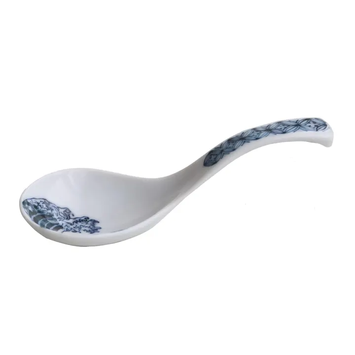 Japanese traditional patterns.~日本の伝統なる文様の一皿が魅了する。~ 「波富士」はた世界でも有名な絵です。日本一の富士山は、幸運を招き繁栄をもたらすとされてきました。 日々の暮らしの中で何気なく目にしている染付のうつわは、和洋問わずどんな料理にも合うので大変重宝するアイテムです。縁起に良い絵柄でもあるので、使う人の心を豊かにしてくれそうです。 ラーメンや小籠包に使いたくなる、口が広めでたくさんすくう事が出来るレンゲです。 柄は引っ掛かりがあるので、どんぶりと一緒に使うときもふちに掛けて使えます。スープに落ちることを防げる形のレンゲです。