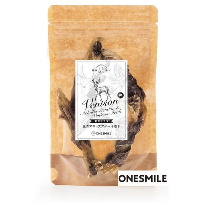 鹿の旨みが際立つ、特別な美味しさ。 鹿アキレスに鹿肉をたっぷり巻いた、ちょっと贅沢なおやつです。 成分表(100g当たり): エネルギー 315kcal 粗タンパク質 81%以上 粗脂肪 3.0%以上 粗繊維 0.1%以下 粗灰分 5.0%以下 水分  13.0%以下 1日当たりの給与量: 超小型犬(5kg以下) 5~10g 小型犬(5~10kg) 15~20g 中型犬(10~25kg) 25~50g 大型犬(25~40kg) 50~70g