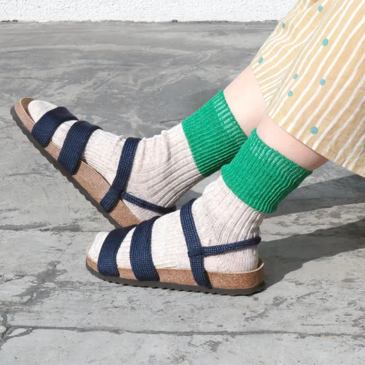 リネン100%糸を贅沢に使ったリブ編みソックス☆ リネン100%糸とコットン100%糸をミックスして編み立てています。 特にリネンの混率が高いため、リネン特有のシャリ感とさらりとした履き心地を存分に感じることができます。
