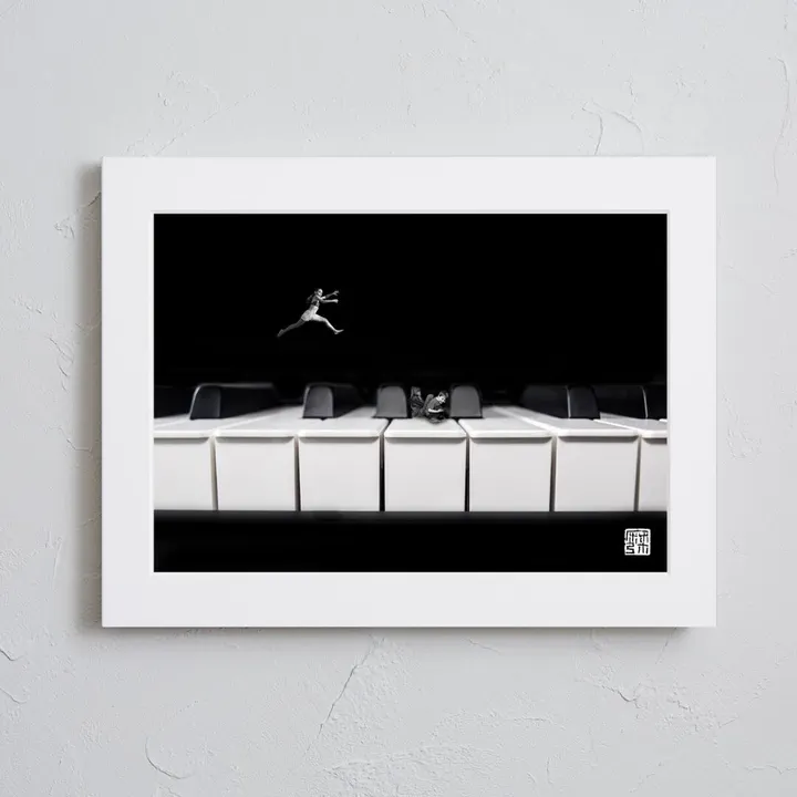 【現代アートポスター】ピアノ 鍵盤 モノトーン 写真コラージュ 子供 キッズ A2(L) 54.5×72.7cm(ポスターのみ)