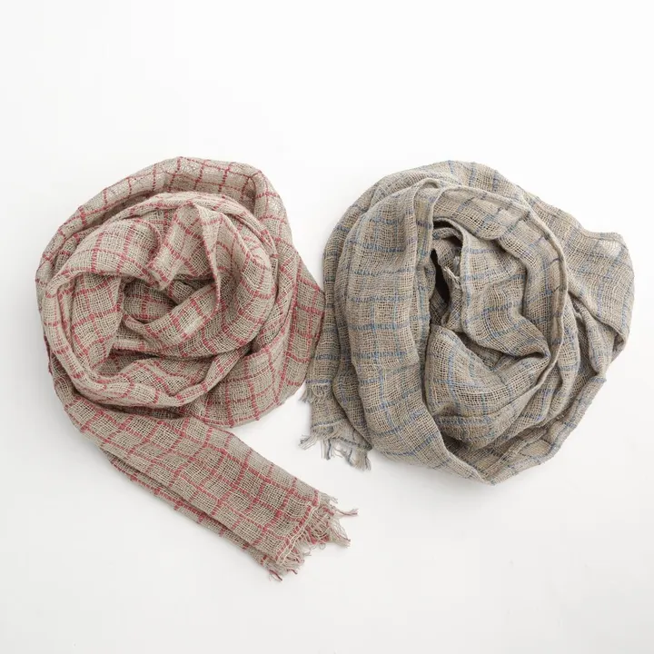 ベージュがかったグレーの地に落ち着いたブルーの格子柄のデザインが上品な印象を与えてくれます。 柔らかく織り上げられた生地は、暑い季節でも快適に身に着けることができ、日焼け防止や暑さ、湿気から、首元を守る効果が期待できます。
