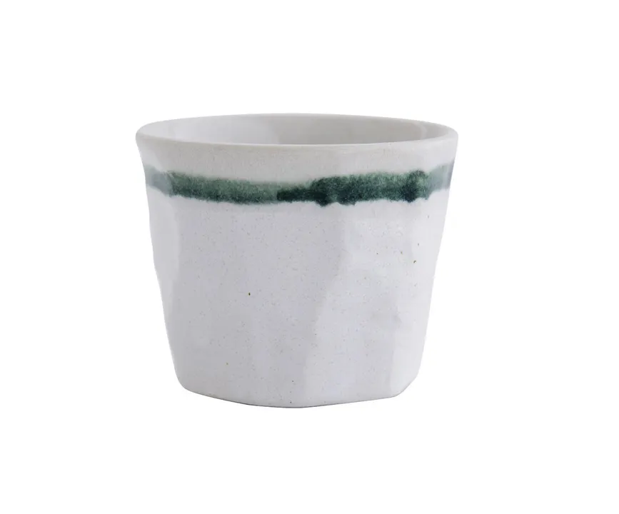 垂らし込みの釉薬が描き出すのは、滲んだ刷毛目の1本ライン。涼やかで凛とした佇まいです。 まるで遠くに連なる嶺の稜線を思わせ、食卓に清々しい風景を添えます。 岩肌のようなゴツゴツとした表面のデザインも、それぞれに個性があって新鮮です。 “蕎麦猪口”としておりますが、フリーカップとして沢山の出番が期待できそう。 お茶やコーヒーなどの飲み物、副菜などのおかず、さらにはフルーツやアイスなどデザートカップとしても◎ シンプルなデザインは和洋問わず馴染み、手持ちの食器とも合わせやすいのが魅力な和食器シリーズには他に茶碗もございます。 ※こちらの商品には釉薬の表面に「貫入」と言われる細かいヒビ割れがございますが、使用している釉薬の特性によるものです。また、発色や刷毛目の出方は個体差がございます。手作りならではの風合いとしてお楽しみください。