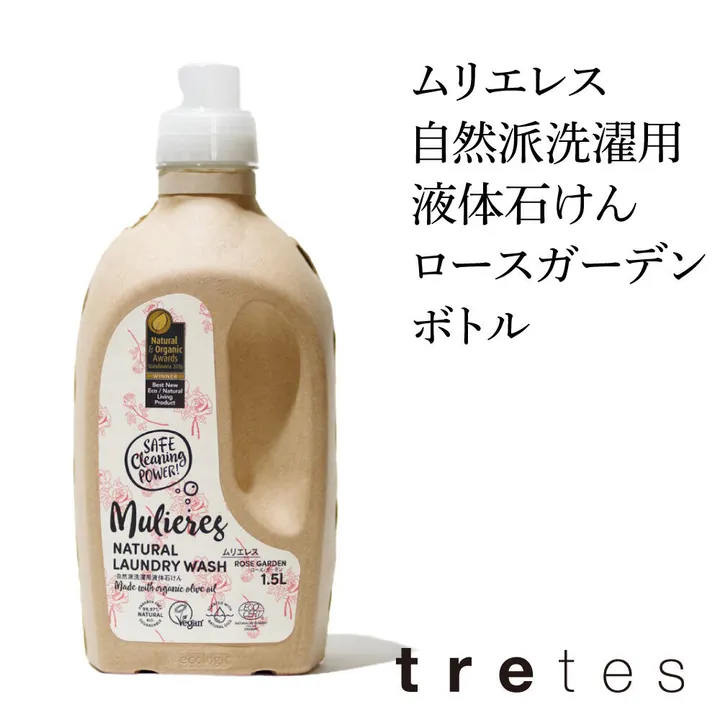 頑固な汚れにも効く!オリーブオイルベースの地球に優しいエコロジカルな洗濯洗剤。古紙ダンボールを再生させた紙製パッケージの本体ボトルタイプ。 北欧・エストニアから届いた自然派洗剤「ムリエレス」。オリーブオイルは、天然の優れた洗浄力と肌に対する刺激がないことで、敏感肌やアレルギー体質のかたに特におすすめです。たくさんのバラが咲くお庭にいるかのような、うっとりする香り。 【内容量】 1.5L 【原材料】 純石けん分(オリーブオイル由来)、ラベンダーエキス、酢酸、グリセリン、エッセンシャルオイル(ラベンダースパイク精油、ローズウッド精油、ゼラニウム精油、バルサムコパイバ精油)、クエン酸、ソルビン酸カリウム、安息香酸ナトリウム 【JANコード】 4518568500147