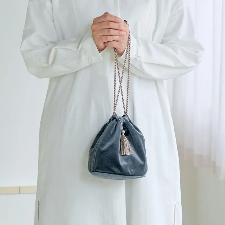 ショルダーバッグ┃ベロアの光沢が美しいフリンジ付のポーチバッグ DG(ダークグレー)