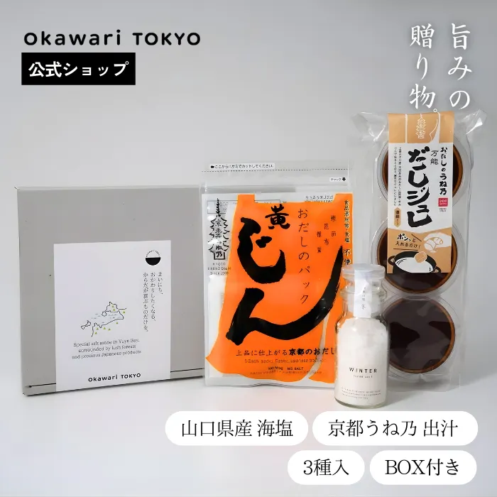 冬の食卓をやさしく彩る、贅沢な味の詰め合わせ 冬の食材を引き立てる「冬塩」、 年末年始のお吸い物や煮物にぴったりの「おだしのパック じん(黄)」、 手軽に本格だし料理が楽しめる「だしジュレ」、 素材の持ち味を大切にした、やさしく上品な味わいのセットです。 季節のご挨拶や、ギフトにもおすすめの一品です。 ◼︎11個〜50個(目安)以上のご注文ご希望の場合 事前にチャットにてご相談ください お届け日希望、【10日前まで】にご連絡いただけますと幸いです 【商品説明】 冬塩 40g おだしのパックじん(黄)7g×5パック だしジュレ 65g×3個 ギフトBOX(白) ■冬塩40g 【原材料】 海水(山口県) 【原産国】 日本 【保存方法】 常温保存 【製造者】 株式会社百姓庵 山口県長門市油谷向津具下1098-1 ■おだしのパックじん(黄) 【原材料名】 かつおのふし(鹿児島県産)、かつおのかれぶし(鹿児島県産)、昆布(利尻島産)、乾しいたけ(大分県産) ■だしジュレ 65g×3個 【原材料名】 しょうゆ(本醸造)(大豆・小麦を含む)(国内製造)、お出汁(かつおのふし、かつおのかれぶし、うるめいわしのふし、昆布、乾しいたけ)、みりん、清酒、小麦醸造調味料、食塩、醸造酢、寒天 【表示すべきアレルギー項目】 小麦・大豆 【賞味期限】 製造から1年 【販売者】 株式会社for TEL:0364270595 ーーーーーーーー ◼︎プレゼントにおすすめ|okawari TOKYOの贅沢調味料ギフト おしゃれで上質な冬の贈り物をお探しの方へ。 料理好きな方へのプレゼント、グルメな方への贈答品、手土産にもぴったりです。 ◼︎贈り物・ギフトに人気の調味料セット 出産祝い、結婚祝い、引っ越し祝い、内祝い、快気祝い、誕生日プレゼント、母の日、父の日、敬老の日、クリスマスプレゼントなど、さまざまなギフトシーンにご利用いただけます。 上品なギフトBOX入りで、贈り物にもそのまま使える仕様です。 ◼︎こんな方におすすめ ・料理好きな方へのギフト ・健康志向、オーガニック志向の方へのプレゼント ・おうちごはんを楽しみたい方への冬の贈り物 ・お歳暮・内祝い・お年賀・季節のご挨拶に ◼︎幅広い年代の方へのギフトにおすすめ ご家族やご友人など、年齢を問わず喜ばれる贈り物です。 お父さん・お母さん・ご両親・祖父母への感謝のギフトはもちろん、 ご兄弟・ご姉妹・親戚・ご友人・職場の方へのお礼やご挨拶にも。 男性・女性問わず贈りやすく、カップルやご夫婦のペアギフトにもおすすめです。