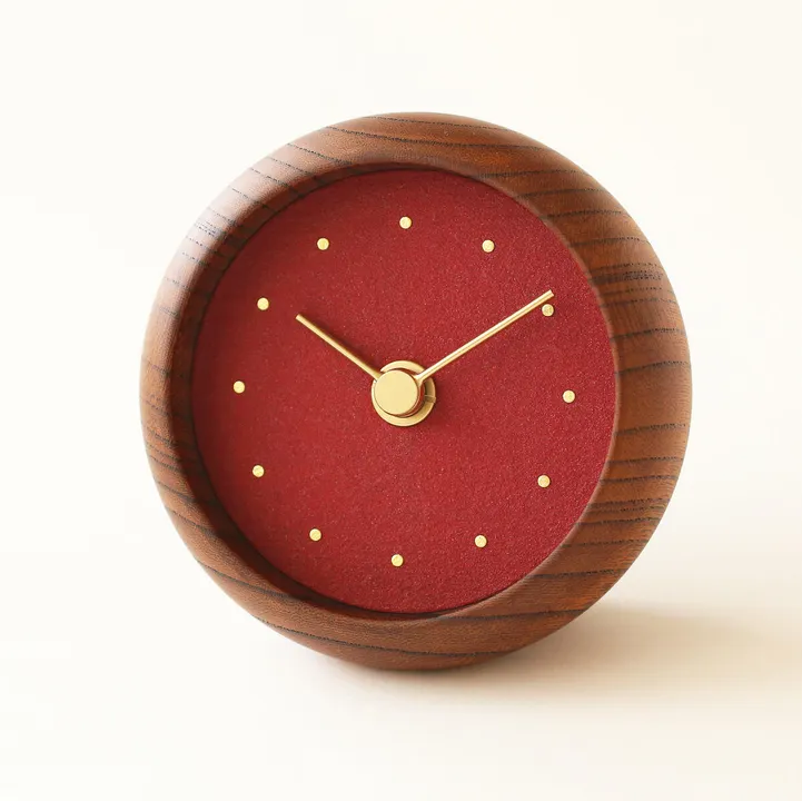 文字盤部分に「辰砂」と呼ばれる赤い鉱物を砕いた岩絵具を使用しました。 日本では縄文時代から採掘され、神聖なものとして古墳の装飾等に使われています。 人工的な朱が作られる前は朱漆や朱肉の顔料として広く使われ、また不老長寿の薬として信じられていました。古来からとても大切にされてきた鉱物です。 本体は、漆器の産地として400年以上の歴史を持つ石川県加賀山中の「ろくろ引き」という、回転する木に鉋(カンナ)を当てて形作る方法で製作しました。 素材はケヤキで、木目が美しく、なめらかでしっとりとした質感です。 文字盤は、下地に金沢市二俣町で和紙作りをされている、石川まゆみさんに漉いていただいた和紙を使用し、 その上に天然石を砕いて作られる「岩絵具」を幾重にも塗り重ねています。インデックスは金沢の金箔です。 ■木の部分の色は、プレーン・ブラウン・ブラックの三色をご用意しております。 ■裏面カバーにオリジナルの刻印を入れることができます。(有料 +880円税込) ■受注生産のため、基本的にご注文いただいてから約2週間のお時間をいただきます。ご了承ください。 【時計部分の仕様】 ・日本製・1年保証・本体のサイズ:直径10cm厚さ5.4cm・使用電池:単3形乾電池 【付属品】 ・単3乾電池1個・取扱説明書1部・牛革製裏面カバー