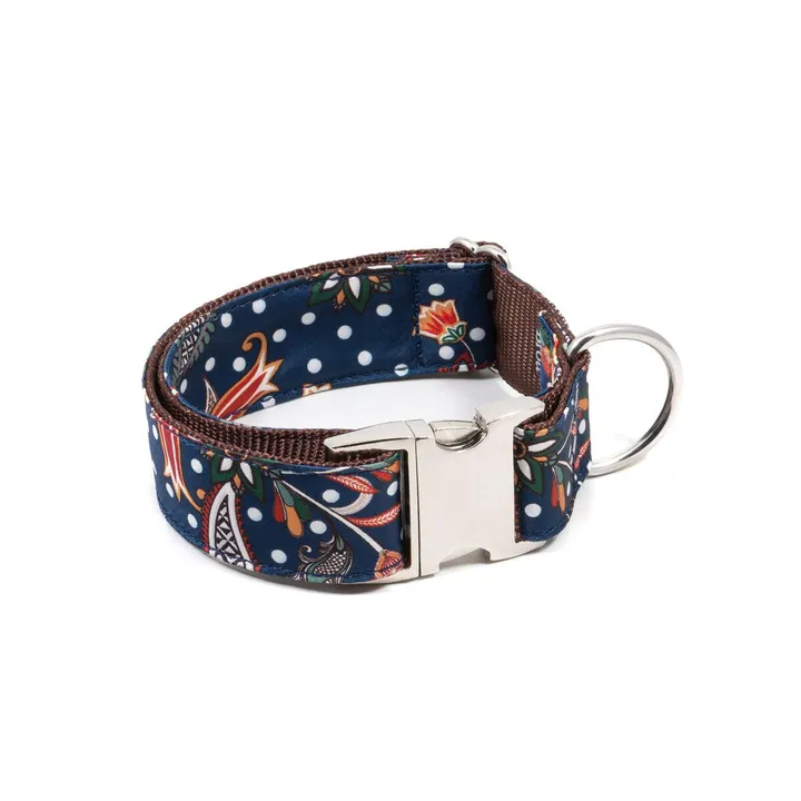 伝統的なマリンスタイルを超え独自のスタイルで愛犬に個性的な輝きを。 濃いブルーを基調としたデザインにペイズリー風の美しい模様が施されており、どんなシーンでも目を引く存在感を放ちます。 太陽の下での散歩や特別なイベントにぴったりの、華やかさを感じられるアイテムです。 ? 素材 裏地:ポリエステル100%リボン(エコテックス認証取得)表地:ポリエステル100%?バックル:特許取得のアルミニウム製サイドリリース
