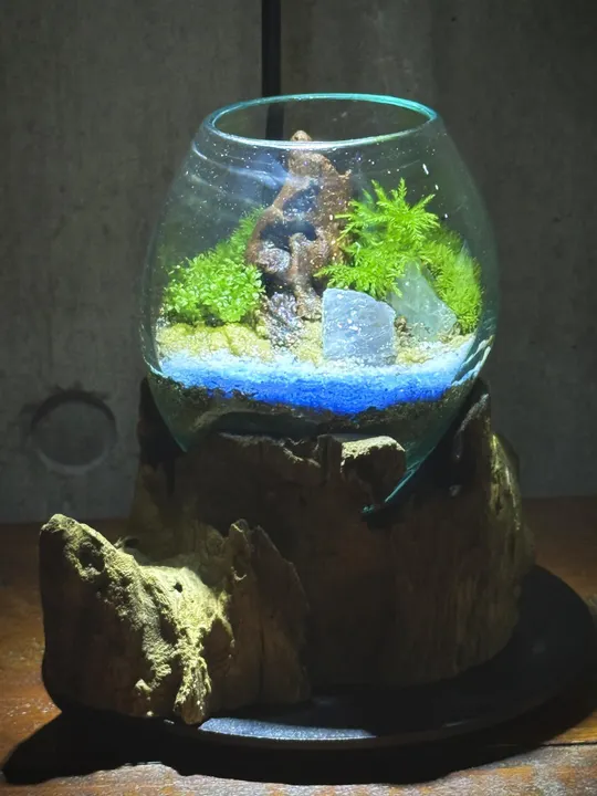 天然のドリフトウッドに合わせ、成型したハンドメイドガラスを乗せたオブジェです。木の形状に合わせることにより1点1点が唯一無二のアイテムとなっております。 ※グラスと木のみのセットとなります。苔テラリウムメーカー様販売の使用例となります。 エアープランツを飾ったり、アクセサリーや鍵を入れる入れ物として、電池式のライトをいれても良し。 ガラスに厚みがある為、多少であれば水も入れることができます。