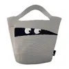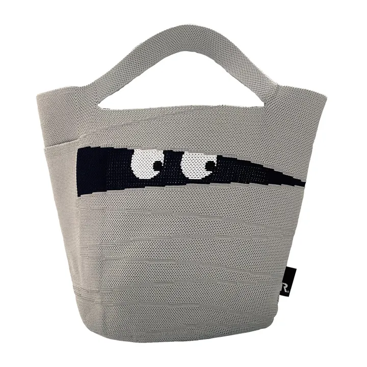お出かけ先ではもちろん!お部屋では収納としても! 四六時中くりくりお目々で、あなたを見守ります。 そっとあなたに寄り添う存在になりたいのです。 ニット工場のサンプル室のハットから着想。 その帽子のようなコロンとしたフォルムが魅力。 ニットなのにしっかりと自立します。 バッグとしても、インテリアとしても。 ざっくりとモノを入れて、バスケットの様に使用ができます。 側面はカンガルーのおなかのポケットのようなルーポケット付き。 ポケット部分は本体と一体で編まれていて、縫い目がないつくり。 ペットボトルからリサイクルした先染めの糸を使用しています。 また、極力縫製の工程を減らすことで環境にもやさしいトートになりました! (先染めの糸は、生地状態での染色より汚染を少なく抑えることができます。)