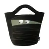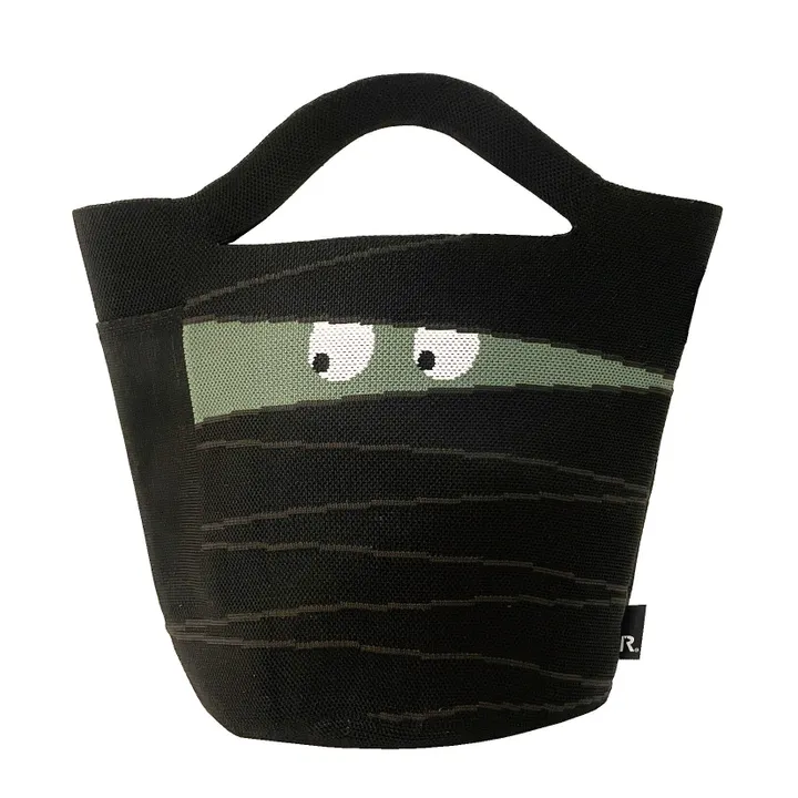 お出かけ先ではもちろん!お部屋では収納としても! 四六時中くりくりお目々で、あなたを見守ります。 そっとあなたに寄り添う存在になりたいのです。 ニット工場のサンプル室のハットから着想。 その帽子のようなコロンとしたフォルムが魅力。 ニットなのにしっかりと自立します。 バッグとしても、インテリアとしても。 ざっくりとモノを入れて、バスケットの様に使用ができます。 側面はカンガルーのおなかのポケットのようなルーポケット付き。 ポケット部分は本体と一体で編まれていて、縫い目がないつくり。 ペットボトルからリサイクルした先染めの糸を使用しています。 また、極力縫製の工程を減らすことで環境にもやさしいトートになりました! (先染めの糸は、生地状態での染色より汚染を少なく抑えることができます。)