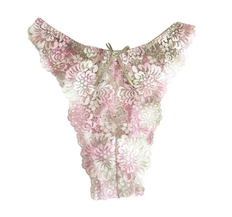 工芸染でストレッチレースを染ました。手染めの為1点1点お色の出方が変わります。その為世界で1点だけの物となります。 独特の美しいカラーをお楽しみ下さい。 マチは綿100%の生地を使用しております。 別売りでノンワイヤーブラ、ショーツがあります。 サイズM(ヒップ87-95)