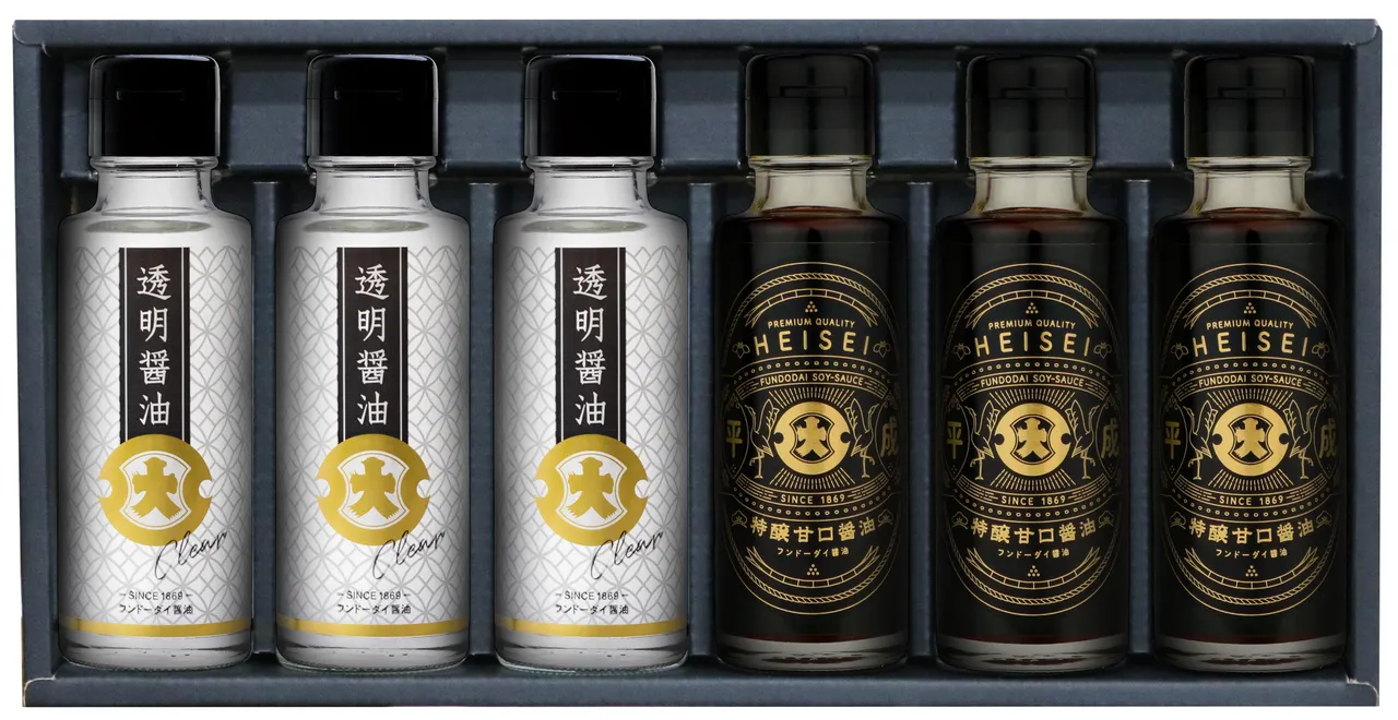 九州ならではの甘醤油口を赤酒、和三盆を使い、甘味料無添加でつくりあげた「平成」。 フンドーダイの独自製法でつくりあげた素材の色を最大限に活かす「透明醤油」の2種類をセットにしましたにしましたギフトやお土産にもおすすめです 特醸甘口醤油平成[100ml]、透明醤油[100ml] …各3本ずつ ▼ご注意▼ ・こちらは生産品です。ご注文を確認後にセットアップしますので、、  発送まで7日(店舗休業日を除く)程度お時間を頂きます。 ・ご注文個数により発送までにお時間をいただく場合がございます。 ・包装や熨斗をご希望の際は、ご注文の際にメールにてご連絡ください。 ※包装はエコ包装(簡易包装)にて承ります