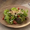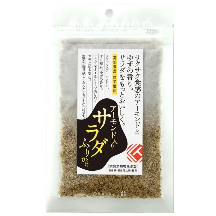 すり胡麻をベースにサクサクとしたクラッシュアーモンドを加え、爽やかなゆずの酸味がアクセント。サラダによく合う洋風ふりかけです。 旬の野菜をざっくりカットして、たっぷりかけてお召し上がりください。 内容量:35g 原材料名:いりごま(国内製造)、アーモンド、食塩、ゆずチップ、かつお節、砂糖、酵母エキス、しょうゆ(大豆、小麦を含む) 賞味期限:180日 栄養成分表示:(100gあたり)エネルギー/597kcal、たんぱく質/23.0g、脂質/46.6g、炭水化物/21.3g、食塩相当量/3.05g アレルギー:小麦、大豆、ごま、アーモンド お召し上がり方 ♦サラダのトッピングとして ♦野菜やきのこの和え物にも ♦ピザやじゃがいものチーズ焼きなどチーズとの相性抜群 ♦揚げ衣に混ぜても 香ばしいクラッシュアーモンドとさわやか柚子で味付けしたサラダ用粉ドレッシング。 油を使用していないのでサッパリとお召し上がりいただけます。