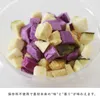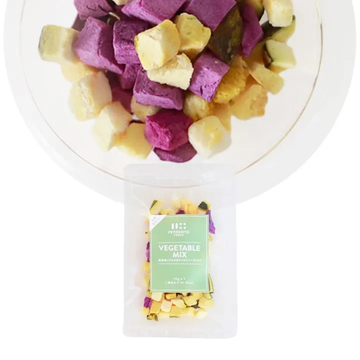 カットした国産のかぼちゃとさつまいもを、蒸かして甘みを引き出し、フリーズドライ加工でサクサク食感に仕上げました。かぼちゃとさつまいもは共に身体の調子を整えてくれる食物繊維とビタミン類が豊富な食材。他の野菜に比べクセも少なく、甘みがあるので、野菜を食べ慣れていないワンちゃんにもおすすめです。 【こんな子におすすめ】 ・ダイエット中の子 ・シニアやパピー 【主な原材料】 さつまいも(国産):腸の健康をサポートする食物繊維とビタミンが豊富です。甘くてホクホク、ワンちゃんも大好物な食材です。 かぼちゃ(国産):免疫力をサポートする抗酸化物質やビタミンAが豊富です。甘くてホクホク、ワンちゃんも大好物な食材です。 【与え方】 ・そのままで おやつや普段のごはんへのトッピングに ・ぬるま湯に浸して 茹で野菜のような食感に。野菜の旨みが溶け出したスープも一緒に ・つぶして 華やかな彩りのふりかけに 【成分内容】 粗たん白質 2.5%以上 粗脂肪 0.3%以上 粗繊維 5.0%以下 粗灰分 2.5%以下 水分 5.0%以下 1g中のカロリー 3.2kcal(1袋合計31.5kcal) 【商品概要】 原材料:国産さつまいも、国産かぼちゃ ※栄養添加物、香料、着色料、保存料は一切使用していません。 ※カボチャの種は手作業で丁寧に除去しておりますが、万が一残っていた場合は取り除いてから与えてください。 加工について:カット後、甘みを引き出すために蒸かしたかぼちゃとサツマイモ。フリーズドライ加工にかけることで、保存料を使用せずに保存期間を延ばせるよう工夫しました。サクサクとした食感を楽しみながら、かぼちゃとサツマイモの栄養をそのまま摂ることができます。 パッケージについて:湿気に強い包材を使用。中身の退色や風味の変化を防ぐため、表面に紫外線を遮断する特殊加工を施しています。また、密閉性を高めるチャック式は、鮮度を保つとともに持ち運びにも便利です。 内容量:10g×2パック 賞味期限:製造日より1年 保存方法:直射日光・高温多湿を避けて保存してください。 その他注意事項:湿気を帯びやすいため、開封後はしっかりと封を閉め、お早めにご使用ください。商品の性質上、稀に輸送中に割れてしまうことがございます。細かくなったものは、トッピング用食材としてご使用ください。 ※現在、原材料の一部を「紫いも」から「さつまいも」に変更しております。画像は旧仕様のものとなりますが、品質や風味には影響ございません。