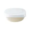 もうラップには戻れない! 冷凍ごはんを美味しく解凍、そのまま食卓へ。 お茶わんになる形 手に持てるサイズ感で、器としてそのまま食卓に出せます。 深さがあるので具材をのせてもあふれません。 ふっくらもちもちの秘密 上スノコ構造で水分をコントロール。 蒸気で加熱する「逆さ加熱」でごはんの粒感・ツヤ・湯気を演出します。 時短&簡単 冷凍→レンジ→そのまま食卓。 ラップ不要でワンアクション。 加熱目安: 冷凍180g → 500W 3分30秒 冷蔵180g → 500W 1分30秒 使い勝手も◎ 食洗機対応でお手入れラクラク。 軽量・割れにくく、ごはんがこびりつきにくい素材です。 アレンジ自在 ごはんだけでなく、少量の野菜も蒸せます。 収納しやすい 冷凍庫でも省スペースでスタッキング可能。 まとめて冷凍しても場所を取りません。
