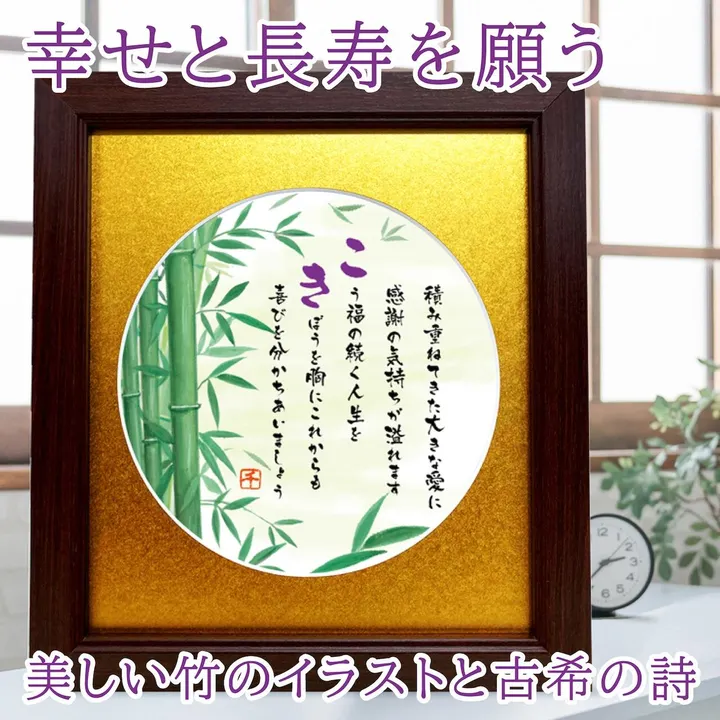 古希 七十歳 節目のお祝いに 想いを伝える感謝の贈り物 お父さん お母さん おじいちゃん、おばあちゃん 大切なあの人へ 「ありがとう」って、いつもは言えないけれど 感謝の気持ちを伝えたい おめでとう!長生きしてね!ずっと仲良く幸せに! そんな想いにピッタリな心温まる メッセージポエムのプレゼント 竹は長寿や健康を象徴し、さわやかな雰囲気を演出します。 【商品情報】 作品はプリント品です(直筆ではございません) 額:ガラス&木製 スタンド:木製 白い化粧箱入り 壁掛け、立てかけも可能 【サイズ】 額の外形:30×31×1cm 内径:24×27cm 【色紙サイズ額色】 茶色 ※当商品は古希を迎えられる方に贈られるギフトです。 ※お届け商品には金額などお買い上げに関する伝票はお付けしていません。 ※ガラス製ですのでお取り扱いはご注意ください。 ※商品画像については、モニターによって色味が若干異なります事ご了承ください。 【贈る方】 自分 両親 お母さん お父さん おじいちゃん おばあちゃん 祖父 祖母 友人 パートナー 父 母 旦那 夫 妻 嫁 先輩 同僚 上司 友達 家族 男性 女性 【用途】 長寿祝い 喜寿 贈り物 感謝 ギフト 周年記念 サプライズ 応援 お祝い 記念日 誕生日