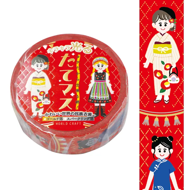 【キラキラ光るたてマス 世界の民族衣装】 ◎7ヵ国の民族衣装を着た女の子!   ◎手帳のデコレーションで女の子のシールや  コーディネートの写真でデコレーションするのが  最近のトレンドです♪ 〜7ヵ国の民族衣装〜 ・ポーランド(ウォヴィチ) ・日本(着物) ・中国(チャイナドレス) ・アメリカ(インディアン) ・メキシコ(チアパス刺繍) ・スウェーデン(ナショナル 王室) ・インド(サリー) ★有名店のプロが厳選して最新文房具のNo.1を決定する『文房具屋さん大賞』の  【2022年度版・マスキングテープ部門】での『5位入賞商品!』※p80〜p81掲載  「キラキラ光るたてマス」  品番:TMKR15-001 〜 012(12柄)  ※紙面掲載価格は価格改定前の価格になります。 ---------------------------------------------------------------------------------------       ☆★☆★ キラキラ光るたてマス ☆★☆★ 「 たてマス 」の柄と仕様が異なるリッチバージョン! 絵柄の長さは広範囲の大ボリューム " 300mm " ! ゴールド × スパークリング の2種類の箔入りでデコレーションの満足感も◎ 『縦柄だから出来る、なが〜いモチーフ』 や 『縦にデコレーション出来ることで 意味を持つ』、"新しいタイプ" のマスキングテープ♪ タテなことに意味がある柄を集めました。<12柄展開> 縦長モチーフだから、従来のマスキングテープよりも たくさんの絵柄が中に入っています。 <12柄一覧> ●GREETING TMKR15-001 / Hearts TMKR15-002 / Flowers TMKR15-003 / Thank you TMKR15-004 / Balloons ●HOLIDAY TMKR15-005 / スイーツ TMKR15-006 / パン TMKR15-007 / 世界の民族衣装 TMKR15-008 / 猫のいる生活 ●ANIMAL TMKR15-009 / のぼり棒犬 TMKR15-010 / もぐらのトンネル TMKR15-011 / ひょっこり猫 TMKR15-012 / 真夜中の花火