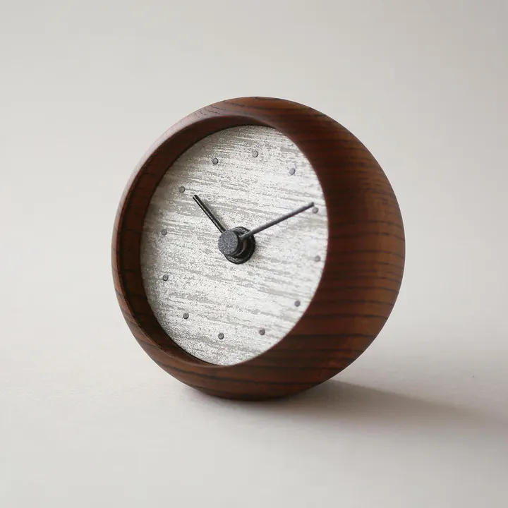 金沢の二俣町で作られている手漉き和紙の上にプラチナ箔を貼りました。 線状の模様が入った和紙(落水紙)を使用し、凹凸の凸部分だけに箔を貼りかすれさせることで、水面や雲のような風景を感じる文字盤になりました。 模様のかたちに糊を置き、その上に金などの箔を貼り付け、その後、余分な箔を刷毛などで払い落として模様を表わす技法を「摺箔(すりはく)」と呼びます。伝統の技法や素材の魅力を、インテリアの一部としてお楽しみください。 摺箔のかすれ具合は一つ一つ異なり、個体差があります。予めご了承ください。 時間を示す点々(インデックス)は、黒の木地のタイプは、黒の天然岩絵具、プレーンとブラウンの木地はいぶし銀箔です。 ■木の部分の色は、プレーン・ブラウン・ブラックの三色をご用意しております。 ■裏面カバーにオリジナルの刻印を入れることができます。(有料 +880円税込) ■受注生産のため、基本的にご注文いただいてから約2週間のお時間をいただきます。ご了承ください。 【時計部分の仕様】 ・日本製・1年保証・本体のサイズ:直径10cm厚さ5.4cm・使用電池:単3形乾電池 【付属品】 ・単3乾電池1個・取扱説明書1部・牛革製裏面カバー