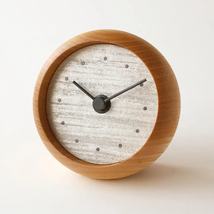 金沢の二俣町で作られている手漉き和紙の上にプラチナ箔を貼りました。 線状の模様が入った和紙(落水紙)を使用し、凹凸の凸部分だけに箔を貼りかすれさせることで、水面や雲のような風景を感じる文字盤になりました。 模様のかたちに糊を置き、その上に金などの箔を貼り付け、その後、余分な箔を刷毛などで払い落として模様を表わす技法を「摺箔(すりはく)」と呼びます。伝統の技法や素材の魅力を、インテリアの一部としてお楽しみください。 摺箔のかすれ具合は一つ一つ異なり、個体差があります。予めご了承ください。 時間を示す点々(インデックス)は、黒の木地のタイプは、黒の天然岩絵具、プレーンとブラウンの木地はいぶし銀箔です。 ■木の部分の色は、プレーン・ブラウン・ブラックの三色をご用意しております。 ■裏面カバーにオリジナルの刻印を入れることができます。(有料 +880円税込) ■受注生産のため、基本的にご注文いただいてから約2週間のお時間をいただきます。ご了承ください。 【時計部分の仕様】 ・日本製・1年保証・本体のサイズ:直径10cm厚さ5.4cm・使用電池:単3形乾電池 【付属品】 ・単3乾電池1個・取扱説明書1部・牛革製裏面カバー