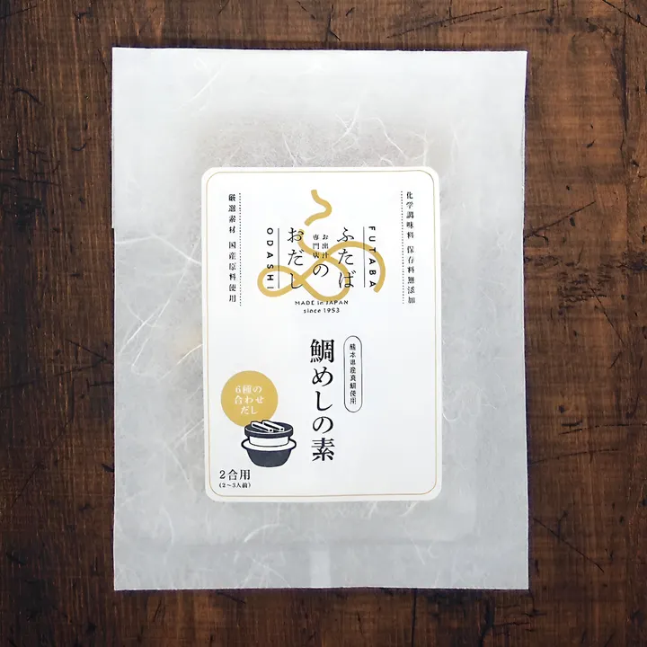 熊本県産真鯛を使用。国産真鯛の切り身に、じっくり煮出した鯛だしと、鰹節、昆布、煮干し、鯖節、椎茸の6種のおだしを合わせ、鯛の風味をいっそう引き立たせました。鯛の旨味と香りを存分に味わえる炊き込みご飯の素です。2合用(2~3人前)